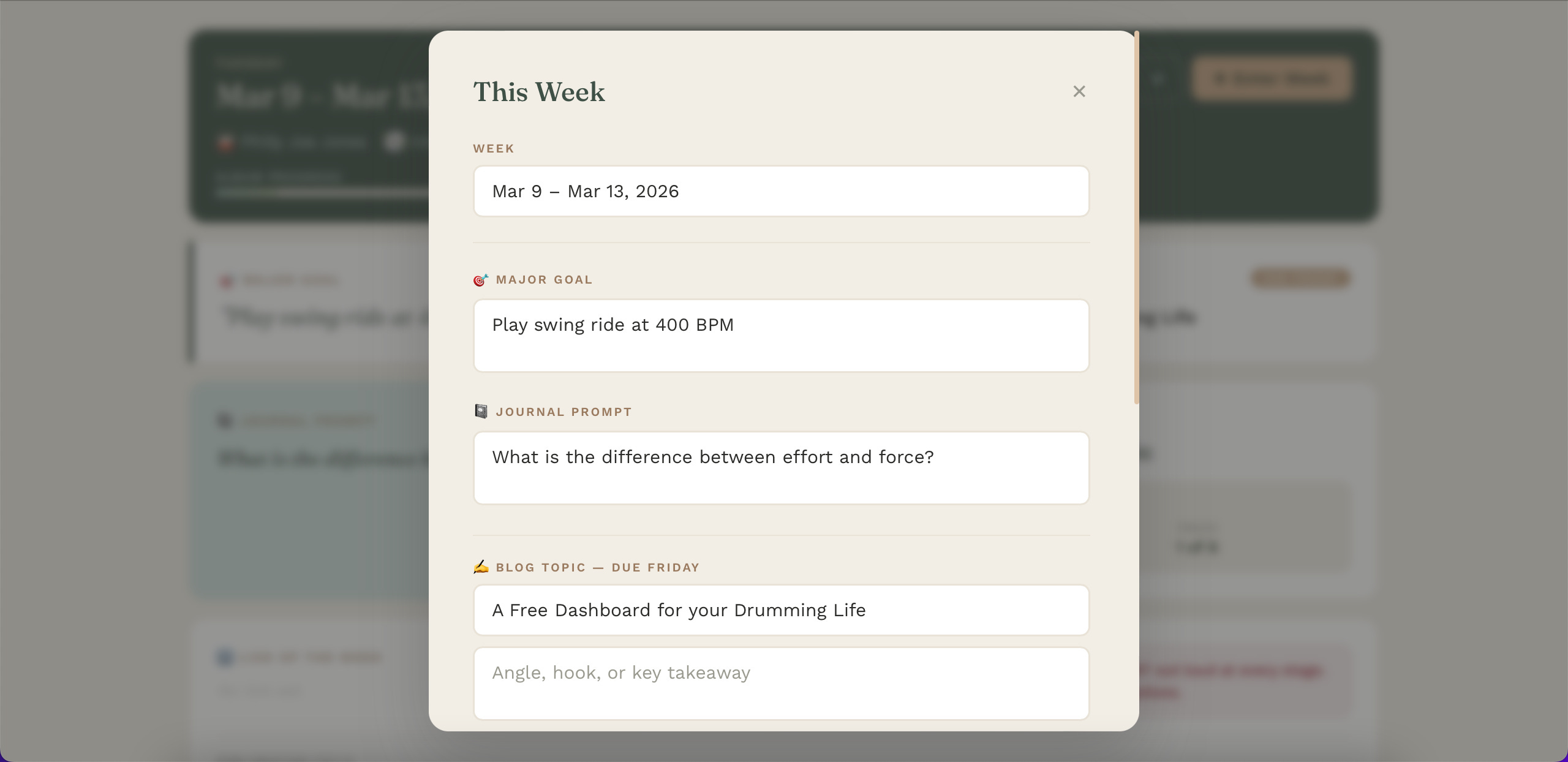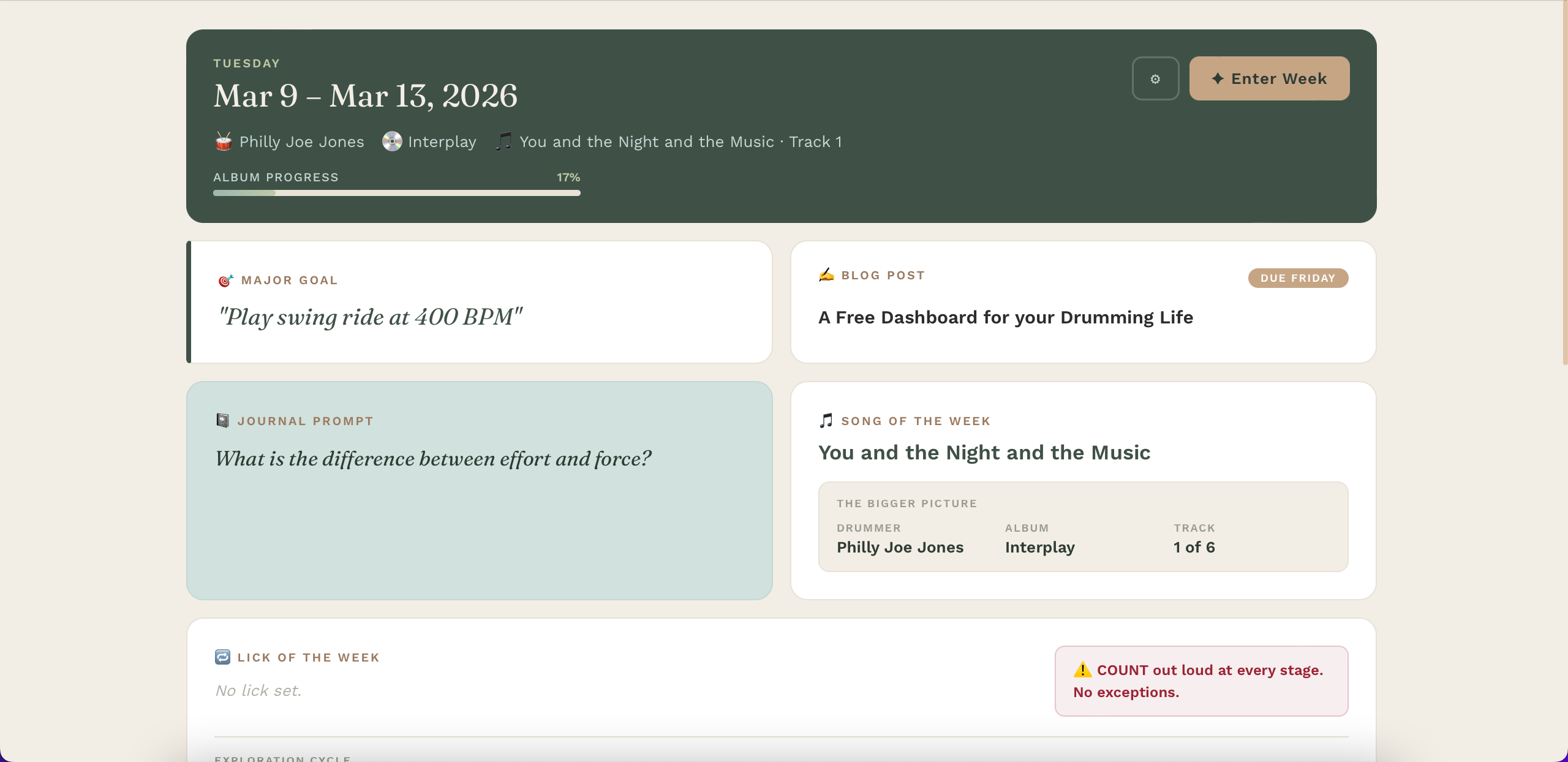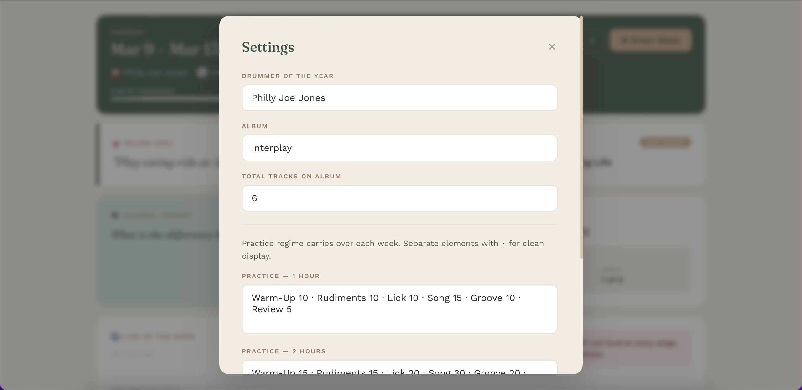 The front page displays your weekly goal, a journaling prompt, and various practice intentions like song and lick of the week. The idea behind the dashboard is making obvious your intentions at a glance, which I’ve found removes ambiguity in building a solid and consistent practice. At the very least, it removes resistance to grinding through rudiments. In this panel, it also displays a custom built set of practice regimes for one, two, and three hour practice slots. Having selected these ahead of time makes having an effective practice much more straight forward.